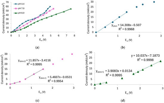 The CVC for the pH 4.4 solution exhibited the typical shape with three well-defined regions (Figure 7a,b). In contrast, the curves for pH 7 (Figure 7a,c) and pH 8 (Figure 7a,d) displayed an additional slope in the ohmic region due to equilibrium shifts and a significant reduction in the plateau length, as already discussed in Section 3.1.2. For the pH 7 solution, the transition between Rohm1 and Rohm2 was observed at 2.8 mA/cm2. However, for pH 8, it occurred at 1.8 mA/cm2, and this behavior was only observed for the neutral/alkaline solutions since both H2PO4− and HPO42− species were present simultaneously at this condition. Similar behaviors have been reported for systems containing phosphate ions in different conditions [33,36] and other amphoteric solutions, such as EDTA [42], citric acid [43], and tartaric acid [43]. An increase in Rohm was observed with increasing pH, despite the rise in equivalent anionic charge. This can be explained by the predominance of H2PO4− ions at pH 4.4 and HPO42− ions at pH 8, as the former exhibit higher diffusion coefficient (0.959·10−5 cm2/s) than the latter (0.759·10−5 cm2/s) [12]. Moreover, the acidic solution (pH 4.4) was more affected by H+ generation resulting from the shift in the phosphate equilibrium than the other solutions because, as previously discussed, the solutions at pH 7 and 8 exhibited buffering capacity, which prevented H+ accumulation in the solution. In this case, the protons generated at pH 4.4 increased the solution’s conductivity and consequently reduced its resistance, unlike the behavior observed for the pH 7 and 8 solutions.