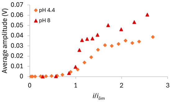 The curves obtained at the lowest current densities exhibited similar shapes for all solutions, as expected, since the dominant mechanism was diffusion/migration, and in this case, Em did not vary with time. In contrast, the curves obtained at higher current densities showed different behaviors for each solution, with intense oscillations in Em. The influence of initial pH on the intensity of the oscillations was assessed by calculating the average amplitude of Em in the ChPs recorded at each current density using the three tested solutions. The corresponding results, plotted as a function of the ratio between the current density and the limiting current density of the membrane/solution system, are shown in Figure 6.