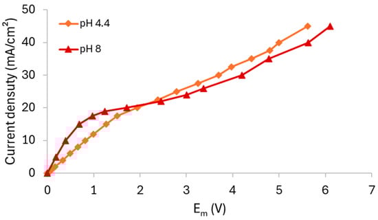 It is worth mentioning that for both solutions at initial pH 7 and 8, the intense transport of generated OH− ions through the membrane likely caused an increase in both the internal pH and the pH at the concentrated membrane surface, potentially leading to the formation of NH3, as illustrated in Figure 2. It is well established that NH3 formed at the enriched membrane surface tends to diffuse back into the dilute compartment, promoting water dissociation [41]. This did not occur with the pH 4.4 solution, since the low bulk pH prevented the membrane pH from reaching values around 9, at which the concentration of NH3 becomes significant. This led to an increase in membrane resistance, as evidenced by the higher Em values observed in Figure 5 when comparing the curves obtained at the same current density for each solution.