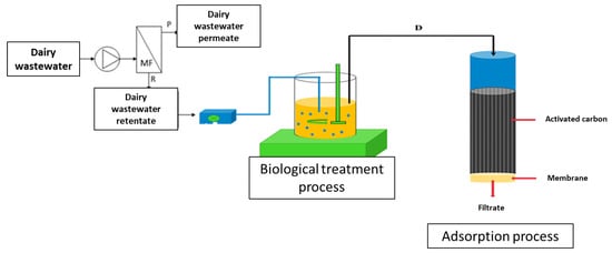 The aim of the present study was to evaluate the feasibility of applying a combined activated sludge–adsorption system for the treatment of two times concentrated MF retentates derived from mixed dairy wastewater. The MF process is commonly employed as a preliminary treatment step, generating two separate streams: permeate and retentate. Both streams were characterised in terms of basic physicochemical parameters, including turbidity, conductivity, COD, TOC, TP and TNb. The two times concentrated retentate was selected for further treatment. The first stage of the treatment process involved biological purification in a sequencing batch reactor (SBR). After 23.5 h of operation, the final decantate showed substantial reductions in turbidity (75.2%), COD (61.6%), TOC (29.8%), TP (46.8%) and TNb (35.4%). The second stage involved adsorption onto powdered activated carbon (PAC) over a 30-minute contact time. Analysis of parameter retention confirmed that the selected PAC effectively adsorbed suspended solids (83.4%), which contributed significantly to the observed reductions in COD (70.5%) and TOC (60.6%). In addition, notable retention of nitrogen (76.8%) and phosphorus compounds (86.0%) was observed relative to the decantate from the biological stage. The combined two-step treatment of the concentrated retentates resulted in retention efficiencies ranging from 24.63% to 97.03%, with the most pronounced reductions achieved for suspended solids (97.03%), total phosphorus (87%) and COD (84%). Despite the high removal efficiencies, the final effluents did not meet the discharge requirements defined by Polish environmental regulations. Therefore, future research will focus on optimising and improving the treatment process to allow safe discharge of treated retentates into the environment.