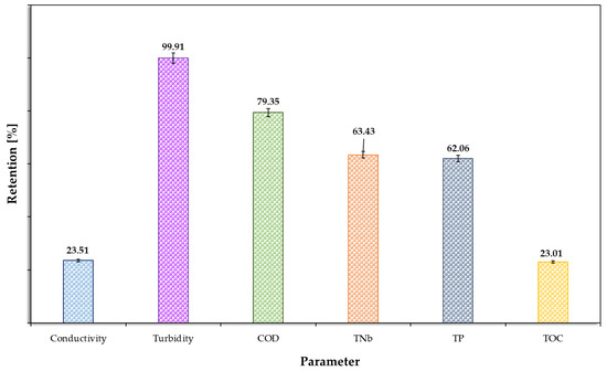 The MF process was used as a preliminary stage to separate undissolved and colloidal particles. This was performed at a pressure of 0.5 bar and a feed flow rate of 400 dm3/h. Permeate flow decreased by 20.6% during the process, compared to an initial value of 20.2 dm3/(m2 h). The MF process, applied to wastewater from cleaning the dairy product production line, produced two post-process streams: permeate and two times concentrated retentate. Following treatment, slight neutralisation occurred, resulting in a pH level of 7.1. The MF process was found to allow the greatest removal of turbidity (99%), chemical oxygen demand (79%), total nitrogen (63%) and total phosphorus (62%), all of which were concentrated in the retentate, which is presented in Figure 2. The significant reduction in turbidity at a retention level of 99% indicates the removal of mainly proteins and fats, which are present in this type of wastewater. A slight decrease in conductivity and total organic carbon content was observed, with retention at around 23% in both cases. Both biogens (phosphorus and nitrogen) and total organic carbon were concentrated primarily in the retentate. The MF process achieved very high removal of suspended solids and substantial reductions in overall COD when comparing the permeate with the raw feed. In contrast, most dissolved species (conductivity, soluble COD fraction, TNb, TP, TOC) passed through the 0.2 µm membrane; combined with the start-up dilution, this explains why concentrations of these dissolved indicators in the final two times concentrated retentate sample are similar to the raw feed values in Table 2, despite the volume reduction. Accordingly, particulate matter was preferentially retained in the retentate, whereas dissolved components largely appeared in the permeate.