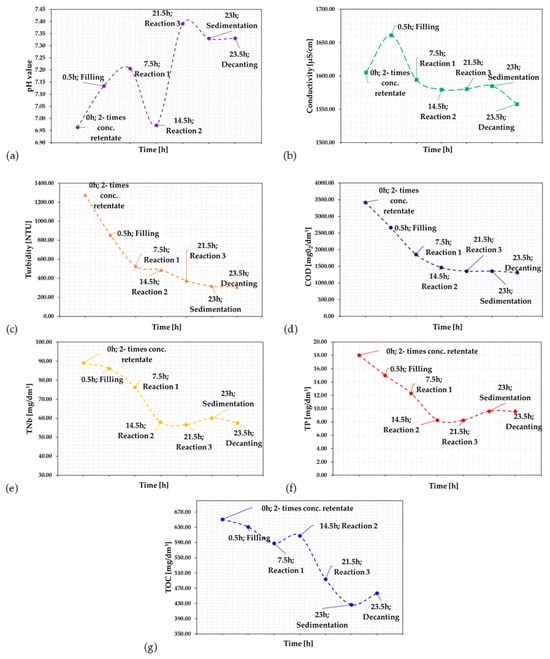 The study observed that the highest retention was achieved for the removal of suspended solids during the entire purification process, with over 75% being removed in the decantation phase (Figure 3). The pH value increased with treatment duration (Figure 3a). The highest value for this parameter was achieved at the end of the reaction phase. The slight decrease in pH during decantation was probably caused by the settling of organic matter residues, whose particles could have affected the pH value of the samples analysed during the reaction phase. The initial increase in conductivity was attributed to the mixing of dairy wastewater with activated sludge, leading to the release of ionic compounds into the liquid phase. As the biological treatment progressed, a gradual decline in conductivity was observed, with the most significant reduction occurring within the first 7 h. During the subsequent hours, the conductivity remained relatively stable. A slight decrease was also recorded during the decantation phase, which may be explained by the residual influence of suspended biomass affecting the measurement. The overall reduction in conductivity is most likely associated with the assimilation of ionic nutrient species by microbial biomass, subsequently utilised for cellular growth. The use of activated sludge treatment allowed for a reduction of turbidity by approximately 75% compared to the initial stream, i.e., twice the concentration of retentate [36].
