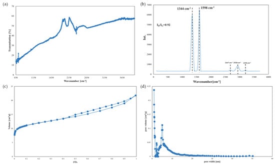 Raman spectrum analysis of PAC carbon confirms the presence of the two characteristic D and G bands of carbon materials at 1344 and 1598 cm−1, respectively (Figure 4b). The material is characterised by a high degree of disorder, as evidenced by the D/G band intensity ratio of 0.92. Additionally, bands appearing in the 2647–3196 cm−1 range indicate this carbon material’s highly amorphous structure [41]. Analysis of the N2 adsorption-desorption isotherm indicates a developed specific surface area. The specific surface area of the PAC carbon was determined using the Brunauer–Emmett–Teller (BET) method. In contrast, the pore size distribution and micropore capacity were determined using the density functional theory (DFT) and t-plot methods, respectively. PAC carbon has a specific surface area of 969 m2/g, with micropores averaging 0.926 nm in size, with a capacity of 0.268 cm3/g. Micropores account for nearly 70% of the surface area of PAC. This structure indicates that pollutant sorption will be physical, mainly resulting from van der Waals interactions [42].