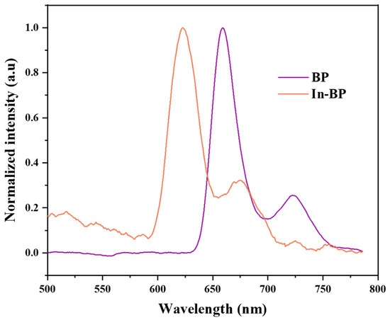 Fluorescence emission spectra of BP and In-BP in DMF (excited at 490 nm).