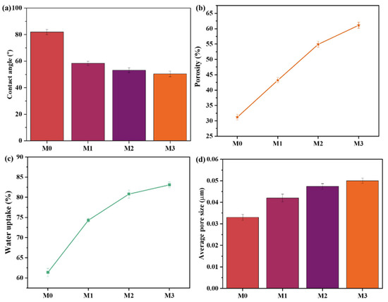 (a) Contact angle, (b) porosity measurements, (c) water uptake, and (d) average pore size of M0–M4 membranes.