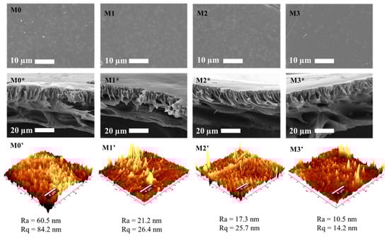 SEM (top surface: M0–M3 and cross-section: M0*–M3*) and AFM (M0’–M3’) images showing the surface morphology of the fabricated membranes.