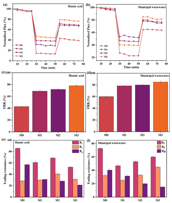 Normalized (a) humic acid and (b) municipal wastewater flux and (c,d) flux recovery ratio and (e,f) fouling resistance of humic acid and municipal wastewater, respectively.
