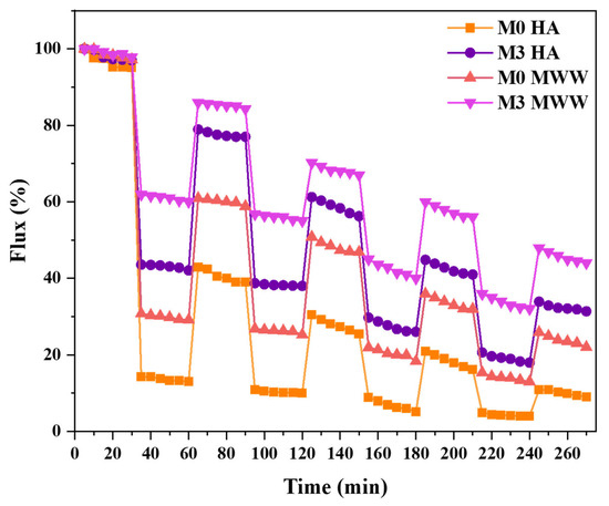 Furthermore, the antifouling performance was assessed through reversible fouling (Rr), total fouling (Rt), and irreversible fouling (Rir), as depicted in Figure 7e,f. These are the key concepts used to better understand the membrane performance. Rt represents the total flux decline (Rr and Rir) caused by the foulant accumulation on and within the membrane surface during the filtration process. Rr happens when foulants can be easily removed from the membrane surface by means of backwashing in this case. In contrast, Rir refers to foulants that cannot be washed off the membrane surface or pores, often requiring the use of harsh chemicals for cleaning, and this rapidly deteriorates the membrane’s structural integrity. The degree of these fouling types depends on the membrane’s characteristics [54,55]. The M0 membrane exhibited the highest Rt (85.7%) after the HA filtration, with 28.5% Rr and 57.2% Rir. A similar trend was observed after the MWW filtration, where the M0 membrane showed the highest Rt (72.7%), comprising 32.7% Rr and 40% Rir. The higher Rt of the M0 membrane is due to its rougher surface (Ra—60.5 nm). During the HA and MWW filtration, foulants were trapped on the surface or within the membrane pores. The backwashing with water was therefore ineffective, as the Rir was higher. The modification of the PES membrane resulted in smoother surfaces, which aided the filtration process; foulants on the membrane surface were more easily removed during backwashing.