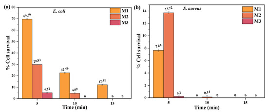 (a) % cell survival of E. coli bacteria after inactivation and (b) % cell survival of S. aureus bacteria after.