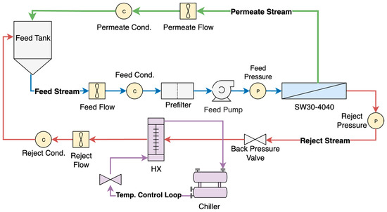 The system used to conduct the experiments was similar to that used in prior published work [10]. A process flow diagram of the system is presented in Figure 1. Feed water flows by gravity from a 70-gallon tank through an in-line flow meter and a conductivity sensor on the pump intake to a positive displacement pump. The Hydra-Cell Pro DX-15 pump (Wanner Engineering, Inc.; Minneapolis, MN, USA) supplies feed water through an in-line pressure sensor to a pressure vessel containing a DuPont FilmTec SW30-4040 RO membrane with an active area of 7.4 m2 (DuPont Inc.; Wilmington, DE, USA). Both brine and permeate flows are recycled to the feed tank. The brine stream flows through another in-line pressure sensor, a back-pressure valve, a heat exchanger, a flow meter, and a conductivity sensor before returning to the feed tank. Permeate flows through the flow meter and conductivity sensor before returning to the feed tank. The temperature of the feed stream is measured by a temperature sensor located at the bottom of the feed tank. It is regulated by a flow valve controlling the 50/50 glycol/water solution from the chiller to the heat exchanger via the system control and data acquisition system (LabJack; Englewood, CO, USA). The in-line pressure sensors were calibrated via an in-line analog pressure sensor. Conductivity probes were calibrated with standards relevant to the conductivity range they are intended to measure. Data was collected in 0.25 s intervals during each experiment.
