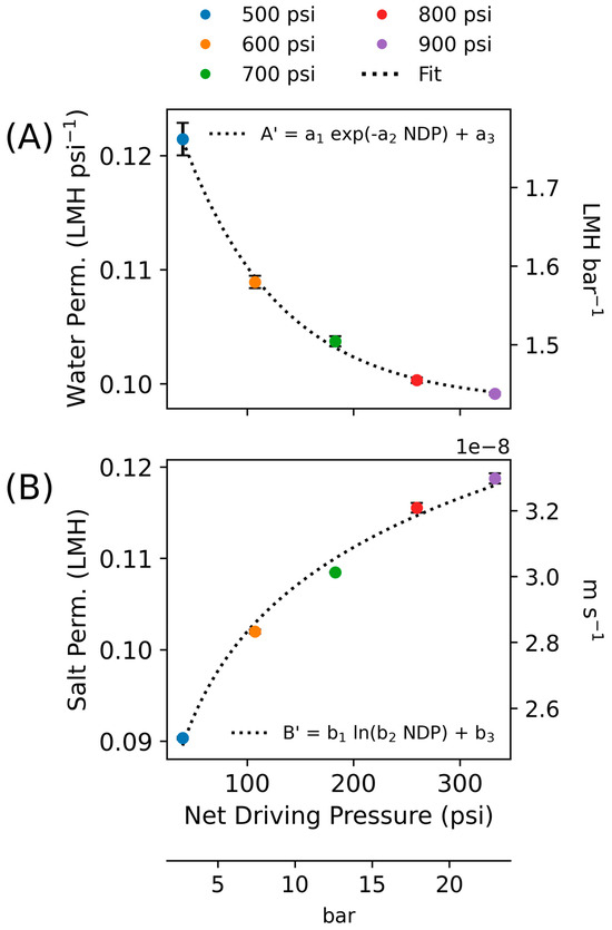 NDP was chosen as the independent variable in these equations because the hydraulic pressure is positively correlated with the measured parameters that are used to estimate NDP via the solution–diffusion equation (see Equation (14)). Due to this linearity, Equation (13) can be solved for and the apparent value can be approximated with Equation (17). Similarly, the form of Equation (18) was chosen based on the observed logarithmic relationship between increased pressure and increased flux and rejection [42]. Note that other relationships could be developed for these apparent values based on the assumptions used.