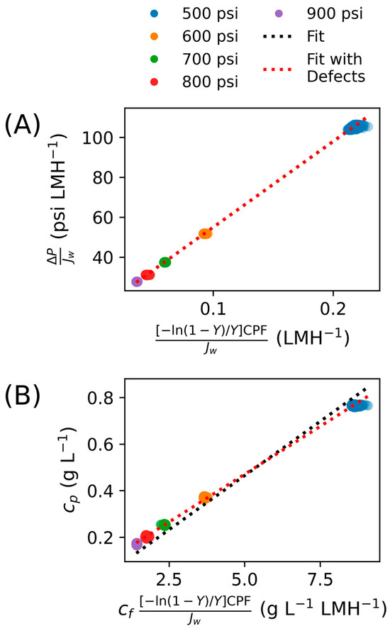 This permeate concentration was also modeled to underpredict at the lower end of the concentration range but overpredict at the upper end (black dashed line in Figure 3B), with MAE of 0.038 g L−1 (22.4%). A similar phenomenon was observed in [43], where this was attributed to defects in the membrane surface. According to that work, “defects” could include “minor structural imperfections, such as microvoids, cracks, or pinholes,” a phenomenon originally observed by Eriksson in [47] and applied to modeling osmotic processes in other contexts [48,49,50]. As in [43], an adjustment to account for these defects was made in the modeling approach according to the solution–diffusion-with-defects model [50]: