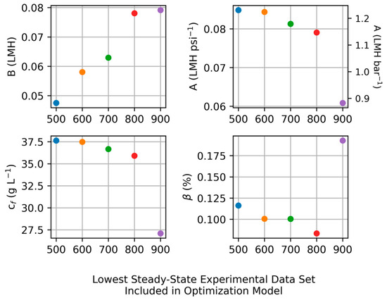 This optimization-based approach was explored more by observing the impact to the modeled parameters of including more or less data in the model. Figure 4 presents the results of this effort. The x-axis is the value of the pressure for the lowest steady-state experiment included in the model. For example, the values for “500” include all the steady-state datasets (i.e., datasets for 500–900 psi), the values for “600” exclude the 500 psi dataset (i.e., datasets for 600–900 psi), and so on. Going from left to right in Figure 4, increasingly fewer datapoints are included in the optimization model. The values for , , and appear in good agreement with each other as long as there are at least two datasets included (i.e., values for 500, 600, 700, and 800 in Figure 4; under these conditions, = 0.083 ± 0.002 LMH psi−1 (1.20 ± 0.03 LMH bar−1), = 0.103 ± 0.011%, = 37.1 ± 0.6 g L−1) while has more deviation (0.060 ± 0.011 LMH). For the case where the single dataset is included, the results for , , and deviate significantly from the other results, suggesting limitations to calculating transport parameters using a single experimental condition.