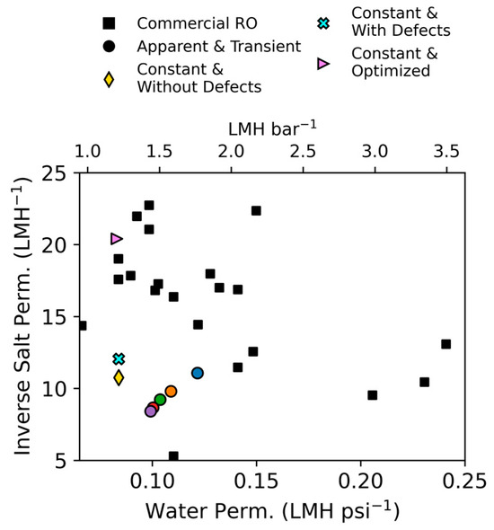 We first present steady-state results for apparent values. Using this approach, parameter values were calculated for each time step, and then averaged values were used to fit the general forms in Equations (17) and (18), presented in Figure 2. The calculated values used to make the regression are presented in Table 2; the regression parameters are shown in Table 3. Each parameter showed a strong fit with R2 of 99.1% for water permeability and 98.8% for salt permeability across the entire steady-state dataset. The water permeability values ranged between 0.10 and 0.12 LMH psi−1 (1.4–1.8 LMH bar−1) and salt permeability values ranged between 0.09 and 0.12 LMH, both of which are within the range of other [29] published values for seawater RO membranes (~0.1–0.25 LMH psi−1 and 0.03–0.19 LMH for water and salt permeability, respectively; see Figure 5) [18].