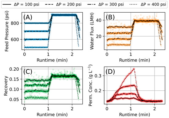 Comparison of collected (dots) to filtered (dashed lines) experimental ramping data for a single cycle with = 10 s and = 100, 200, 300, 400 delineated by line style; (A) feed pressure, (B) water flux, (C) recovery fraction, and (D) permeate concentration.
