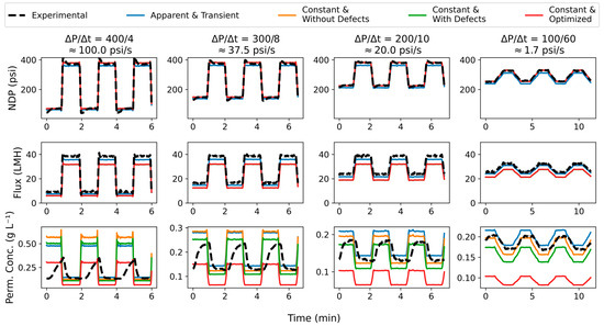 The time-series results for four select experiments are presented in Figure 7, representing a diversity of ramp rates. From left to right, the columns represent / = 400/4; 300/8; 200/10; and 100/60. From top to bottom, the rows represent NDP, , and . The dashed black line is the experimental values for each parameter, and the colored lines represent from using the different transport parameter values determined in this study. For NDP and , all of the simulations using constant parameters produced a nearly identical result, so those results appear overlaid with each other in the figure. In general, the simulation results match what might be expected under such conditions: at higher NDP, is higher and is lower. Based on visual inspection of this figure, the apparent and transient assumption produces the outcome closest to the experimental value for . None of the time-series simulation results for appear to be close to the experimental result. But this is not surprising because the experimental results have an inherent time delay due to placement of the sensor. For that same reason, the simulation results are the most interesting, as we are able in a sense to get a glimpse into how the time series would appear if that delay were eliminated since the simulation is showing the behavior right at the membrane.