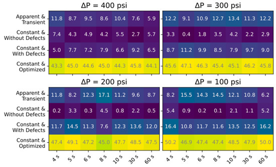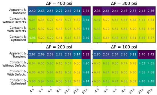 Figure 8 presents the MAE of and Figure 9 presents the absolute percent error in for the simulations of all 28 experimental conditions. The results are grouped by , with the x-axis representing and the y-axis representing the different approaches used to calculate transport parameters. Feed concentration was observed to decrease ~5% between steady-state and experimental regimes due to system flushing; this would minimally impact simulation predictions but still result in valid comparisons since the effect is across all ramping experiments. For , the results show that using apparent and transient transport parameters produced the most accurate simulations of the different parameter combinations, particularly for slower ramp rates. The rest of the approaches resulted in similar MAE, with slightly lower MAEs for the longest ramp rates. For the error presented in Figure 9, assuming constant parameters without defects produced the closest results, though the estimations without defects and assuming apparent and transient are also close. A limitation in comparing simulated to experimental is that due to the delay in conductivity measurement, the beginning of the modeled time period reflects higher pressures (and therefore lower conductivity measurements), resulting in lower estimated , and this effect is enhanced for shorter ramp times. This is less of an issue in the comparative analysis presented here (since this error would be reflected in all the comparisons), but accurately predicting instantaneous permeate concentration would require properly characterizing the residence time distribution for the permeate channel, collection tube, and process tubing between the membrane outlet and the conductivity sensor. Though this was beyond the scope of this work, simplifying assumptions can be made, as detailed in [43].