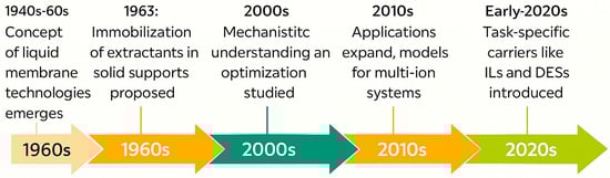 During the 2000s, the research focus shifted to mechanistic understanding and optimization. Studies characterized how polymer–carrier ratios, plasticizer concentration, and matrix hydrophobicity influenced membrane permeability, selectivity, and reusability []. Researchers also began exploring alternative carriers, such as calixarenes and phosphonic acids, enabling the separation of rare-earth elements and toxic heavy metals under environmentally relevant conditions.