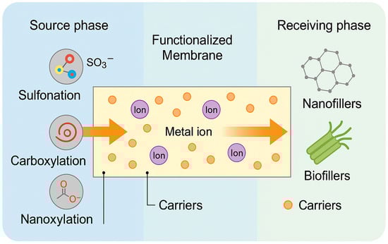 These combined effects on ion–carrier interaction, membrane porosity, phase retention, and fouling resistance highlight the pivotal role of matrix design in controlling selectivity. The diverse functionalization strategies and their impact on transport behavior are conceptually illustrated in Figure 3, which summarizes how sulfonation, carboxylation, nanofiller integration, and biofiller blending shape ion migration from the source phase to the receiving phase across the membrane.