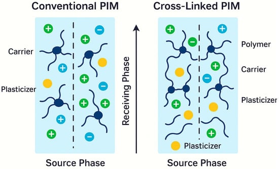 Schematic comparison of conventional vs. cross-linked PIM structures (🟡—Carrier; ⚫—Plasticizer; 🔵—Anion; 🟢—Cation).