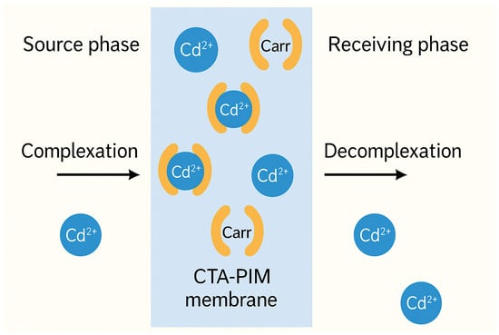 Schematic representation of Cd2+ transport across a CTA-based PIM from the source to receiving phase, showing complexation/decomplexation with the carrier.
