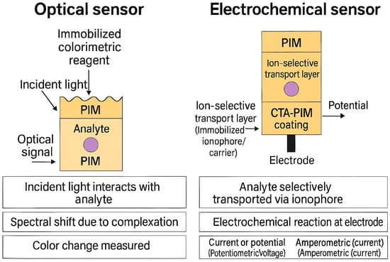 Analytical platforms have also been integrated with PIMs to preconcentrate and speciate metal ions, pharmaceuticals, and organic pollutants. The immobilized carrier environment enables the enrichment of trace analytes, improving detection sensitivity in optical and electrochemical sensors. Recent developments include optode-based PIM sensors with colorimetric responses to mercury(II) and silver(I), demonstrating rapid and selective detection in field conditions [].