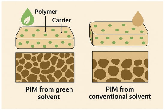 A breakthrough in PIM technology occurred in the early 2020s: the introduction of ionic liquids (ILs) and deep eutectic solvents (DESs) as task-specific carriers. These carriers offered better chemical adjustment, thermal stability, and selectivity for both inorganic and organic targets. In a detailed 2024 review, Adigun et al. noted that IL-based PIMs are superior in terms of extraction capacity, chemical resistance, and long-term reusability, especially when handling complex effluents []. A similar wave of innovation focused on using DES-based carriers, leveraging their biodegradability and lower toxicity. Simultaneously, sustainability in PIM fabrication became a central research priority. A 2025 review by Senila et al. summarized advances in green PIM production, including the use of biodegradable polymers (e.g., PLA and chitosan), biofillers (e.g., acetylated lignin), and green solvents (e.g., Cyrene™, 2-MeTHF, and ethyl acetate) []. Studies have demonstrated that these materials could maintain high transport efficiencies while reducing the environmental footprint of membrane production. For instance, Kaczorowska et al. (2022) fabricated CTA-based PIMs incorporating lignin for Ni(II) recovery with industrial wastewater relevance [].