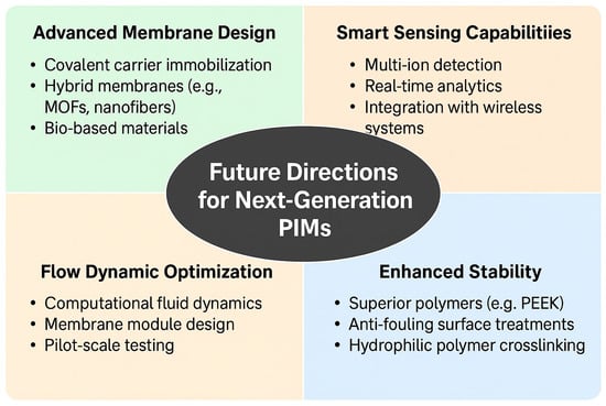 The future direction of carrier development for PIMs is moving toward multifunctional and stimuli-responsive extractants, including smart ILs capable of pH- or redox-controlled binding and biomimetic carriers inspired by metalloproteins. In parallel, efforts are underway to minimize carrier leaching and toxicity through covalent immobilization or encapsulation within nanoporous frameworks.