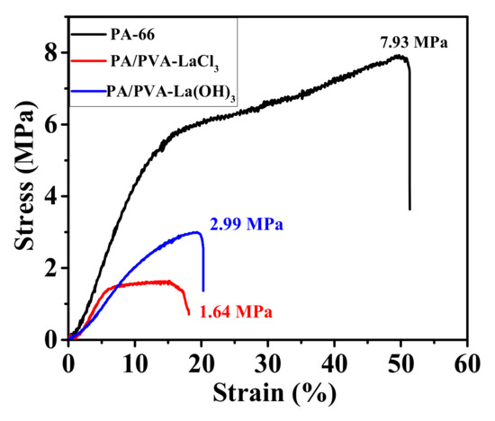The mechanical properties of PA-66, PA-66/PVA-LaCl3, and GA-crosslinked PA-66/PVA-15%La(OH)3 nanofibrous membranes were measured by tensile experiments, as shown in Figure 3.