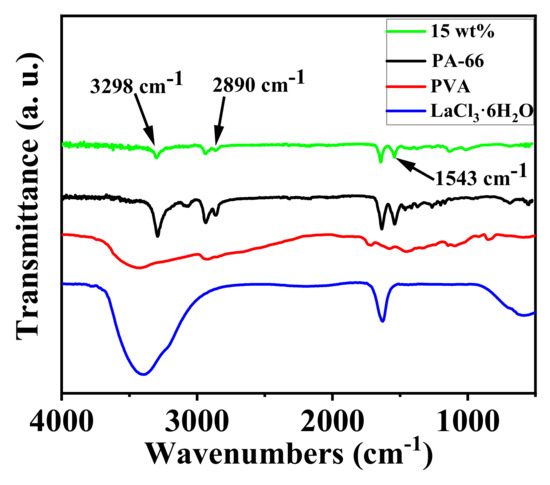 ATR-FTIR spectra of PA-66, PVA, LaCl3·6H2O, and nanofibrous composite membrane PA-66/PVA-15%La(OH)3 were achieved as exhibited in Figure 5.