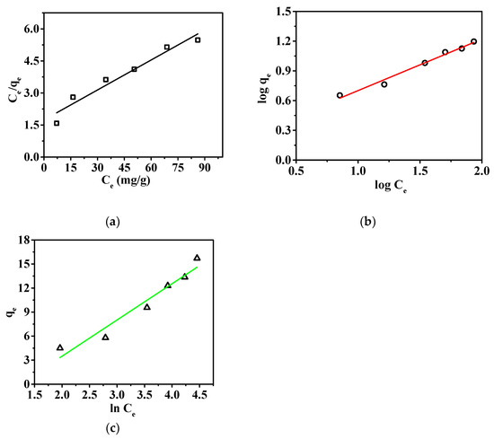 Adsorption isotherms: (a) Langmuir, (b) Freundlich, and (c) Tempkin adsorption isotherms, respectively.