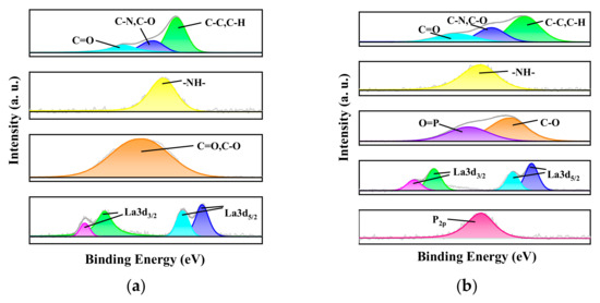 After adsorbing phosphate, the nanofibrous composite membrane exhibits a double-peak characteristic of O, with a P=O characteristic peak at 532.75 eV and a C-O characteristic peak at 531.1 eV [61,62]. By comparing the O1s peak areas before and after adsorption, it is evident that the O1s peak after adsorption increases to 1.43 times its original value, further proving the introduction of new oxygen-containing groups in the membrane. Combined with the previous XPS analysis of the nanofibrous composite membrane, it is known that the La characteristic peak shifts positively by 0.5 eV after phosphate adsorption. This indicates the formation of a strong coordination bond (La-O-P) between the phosphate group and La3+, leading to a decrease in the electron cloud density of La and consequently shifting the binding energy of the La 3d orbital towards higher binding energy, which is consistent with the observed shift [63].