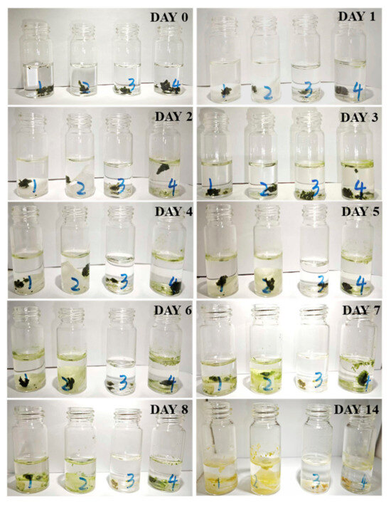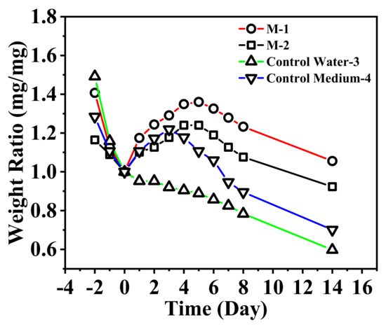 The first three days represent the change in Mougeotia mass in the dark, while days 0–14 represent the change under light cultivation. The data confirm that in bottles 1 and 2, Mougeotia reached their mass peaks on the fifth day at 1.36 and 1.24, respectively, after which the mass began to decline. The growth rate of Mougeotia in bottle 1 was higher than that in bottle 2, likely due to the higher amount of phosphate-releasing nanofibrous membrane added to bottle 1, which released more phosphorus fertilizer than bottle 2.