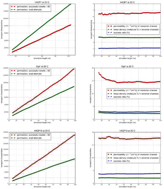 MD simulation results at 25 °C. In the left columns, the number of successful (×50) was compared to the total number of permeation attempts. The vertical axis shows the number of successful events and the total number of attempts during the time interval (0, t), while the horizontal axis is the simulation time t. Columns on the right indicate the permeability values, linear density and success ratio over the simulation length (0, t) for 15 ns < t < 100 ns.