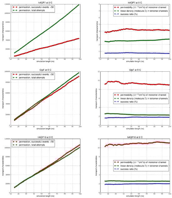 MD simulation results at 5 °C. In the left columns, the number of successful events (×50) was compared to the total permeation attempts. The vertical axis shows the number of successful events and the total number of attempts during the time interval (0, t), while the horizontal axis is the simulation time t. Columns on the right indicate the permeability values, linear density and success ratio over the simulation length (0, t) for 15 ns < t < 100 ns.