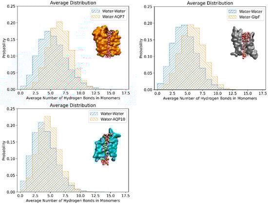 Figure 6 depicts the probability histograms of the hydrogen bonds between single-file water molecules in the channels (in blue) and between the water molecules and pore-lining residues for all three aquaglyceroporins (in orange) at 25 °C. These values were averaged across the monomers (values for individual monomers are in Supplementary Information Figures S3–S5 for 25 °C, and Figures S6–S8 for 5 °C). Also shown are the MD snapshots of single-file waters in the respective channels. The approximate number of water–protein hydrogen bonds was ~6.5 for AQP7, followed by ~5.5 for GlpF, and ~5.0 for AQP10 at both 25 °C (Figure 6) and 5 °C (Supplementary Information Figure S2). For all three aquaglyceroporins, the number of water–water hydrogen bonds was consistently lower than the water–protein hydrogen bonds, i.e., ~4.5 for AQP7, followed by ~4 for GlpF and ~3.5 for AQP10. Interestingly, the number of hydrogen bonds between the single-file waters and channel residues inversely correlated with the permeability values of AQP7, GlpF and AQP10, i.e., increasing hydrogen bonds (or single-file waters) decreases aquaglyceroporin osmotic permeability. For AQP10, the reduced interaction of water molecules with the channel residues coupled with the widened channel radius may have contributed to the increased permeability. Additionally, amongst the aquaglyceroporins studied, AQP10 has the shortest region of single-file waters, with most of the water molecules in the channel in a more compacted and bulk-like state. Single-file waters act as a rate-limiting step, preventing water molecules from overtaking each other and only permitting a single-direction water flow at any instance. Similarly, other studies have found that water permeability is influenced by the interactions between water and the pore-lining residues [43,44], and notably Horner et al. found that pf increased exponentially with a decreasing number of hydrogen bond donating or accepting residues in the channel wall [4,45].