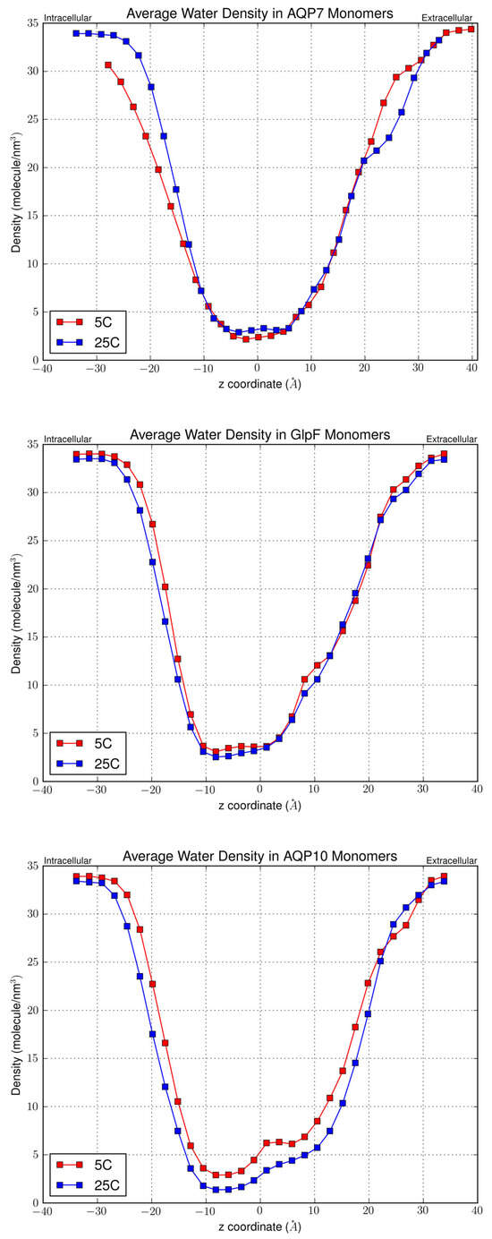 In this study, we further applied the TST method specifically for the study of aquaglyceroporins AQP7, AQP10, and GlpF for the computation of osmotic permeabilities at 5 °C and 25 °C. We excluded glycerol from the simulations, as it has been previously shown that aquaglyceroporins have a high affinity for glycerol, which negatively affects osmotic permeability [5,18,33,34,35,36]. As will be detailed later in this paper, we found that the water permeability of AQP10 was the highest, followed by GlpF, and then AQP7. Interestingly, our results agreed with Horner et al., who found a direct correlation between the number of single-file water molecules in the channel and the permeability of water through the calculation of single-channel osmotic permeability, pf, with great accuracy from in vitro studies [4]. Previous experimental and computational results on GlpF also concurred with our findings [3,4], which confirmed the validity of our method. To further study the basis of the differences in permeability, we also examined the linear density of water in the channels and the differences in the selectivity filter (sf) of these aquaglyceroporins.