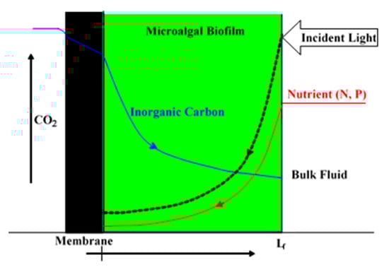 The schematic diagram of the MC-MBPBR is shown in Figure 1. The microalgal biofilm is attached on a flat-sheet gas-permeable hydrophobic membrane. The following assumptions are made to derive the governing ordinary differential equations (Equations (1)–(3)) of CO2, N, and P diffusion and reactions of CO2 and nutrients (N and P) in the biofilm: