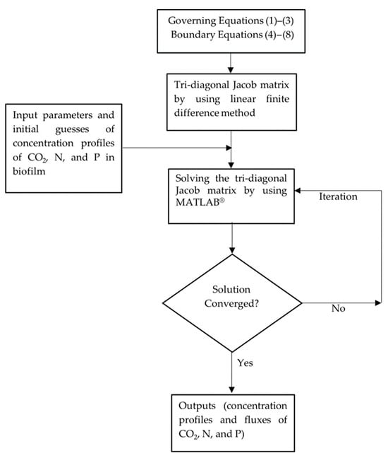To simplify the computations, the linear finite-difference method was used to establish the tri-diagonal Jacob matrix, and iteration was conducted to find the converged CO2, N, and P concentration profiles and the fluxes of CO2 (g CO2/m2·s) and nutrients (N and P) (g N/m2·s or g P/m2·s) to the microalgal biofilm. The impacts of CO2 partial pressure, influent NO3−-N and HPO42−-P concentrations, and biofilm thickness on the biological performance of the MC-MBPBR were investigated. MATLAB® software (2024a version) was employed to iteratively solve the linearized tri-diagonal Jacob matrix until convergence and to perform case studies, graphing, and relevant analyses.