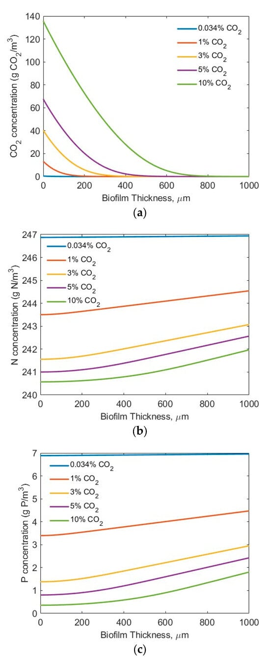 The modelling results suggest that the penetration distance of the CO2 (Figure 3a and Figure 4a) increased with an increase in the bulk gas phase CO2 concentration. Under the high-strength industrial wastewater conditions (influents SN-b = 247.1 mg N/L; SP-b = 7.12 mg P/L), even at the highest tested CO2 concentration of 10%, the penetration distance of the CO2 was approximately 700 µm, and much smaller biofilm penetration distance was observed at lower bulk gas phase CO2 concentration (Figure 3a). On the other hand, under the low-strength wastewater conditions (SN-b = 15 mg N/L; SP-b = 2.5 mg P/L), a penetration of CO2 into the wastewater stream at CO2 concentrations of 3% and 10% was observed (Figure 4a). Not all the CO2 transferred across the membrane into the biofilm was utilized for bioreaction. These results suggest that the utilization of the CO2 would change in terms of the biofilm thickness and influent nutrient conditions. Thus, an optimal gas phase CO2 concentration could be identified for practical application, based on the influent nutrients’ conditions and the biofilm thickness.
