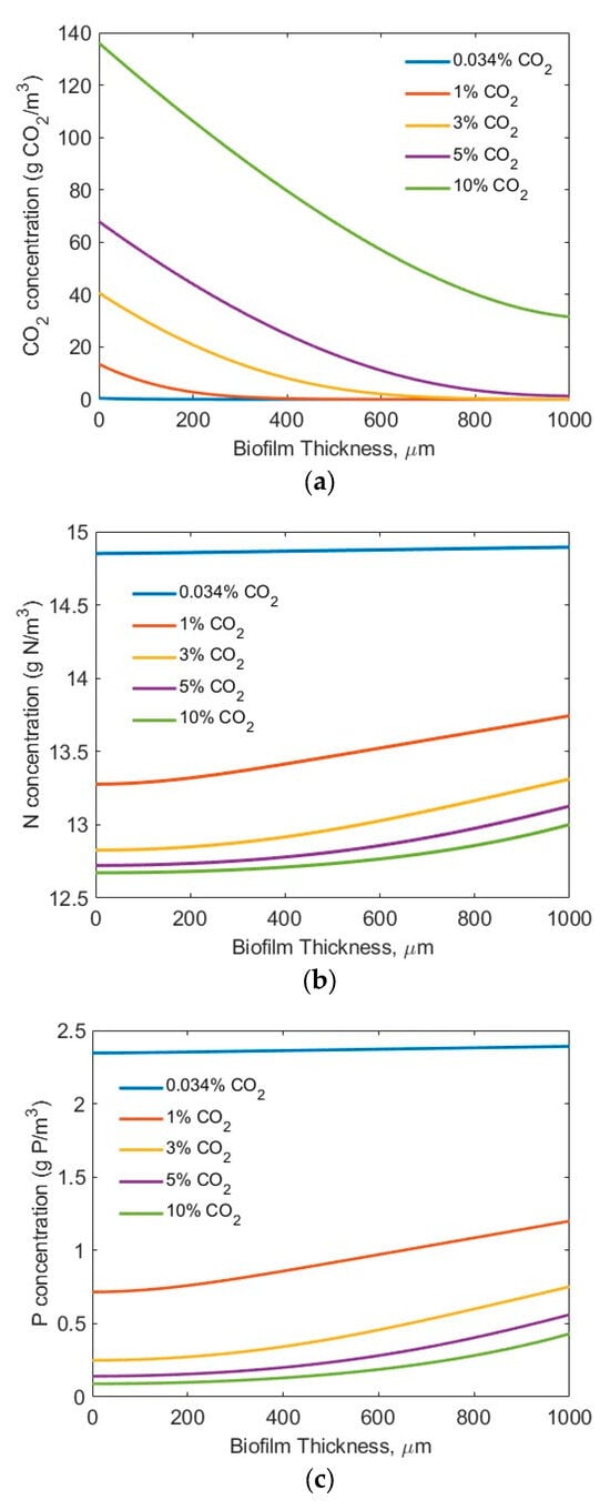Figure 3b and Figure 4b suggest that the TN penetrated through the entire biofilm to the membrane–biofilm interface (x = 0) and that TN is available for bioreaction across the entire spread (thickness-wise) of the biofilm. However, the penetration distance of the TP was limited (Figure 3c and Figure 4c) under the tested conditions. A very low TP concentration (<0.5 mg P/L) at the membrane–biofilm interface (x = 0) was observed even under the conditions of high TP concentration (SP-b = 7.12 mg P/L) and high bulk gas phase CO2 concentration (10%). The limitation of TP (Figure 3c) was worsened under the low-strength wastewater conditions (SP-b = 2.5 mg P/L). Extremely low TP concentrations of less than approximately 0.25, 0.15, and 0.1 mg P/L at the membrane–biofilm interface (x = 0, Figure 4c) were observed at the bulk gas phase CO2 concentrations of 3%, 5%, and 10%, respectively. These results suggest that the CO2, TN, and TP could all be the potential limiting factors for bioreaction, depending on the tested process conditions. A further increase of the bulk gas phase CO2 concentration would increase its penetration distance; however, there is a limitation of the highest CO2 concentration that would not inhibit microalgae growth [43]. In the meantime, the entire spread (thickness) of the biofilm was not used for reaction. A significant increase in biofilm thickness only increased the mass transfer resistance for diffusion of the CO2, TN, and TP, but a large portion of the biofilm did not participate in the bioreaction, due to a lack of CO2, TN, and/or TP molecules or ions in that portion of the biofilm. This suggests the importance of controlling the biofilm thickness.