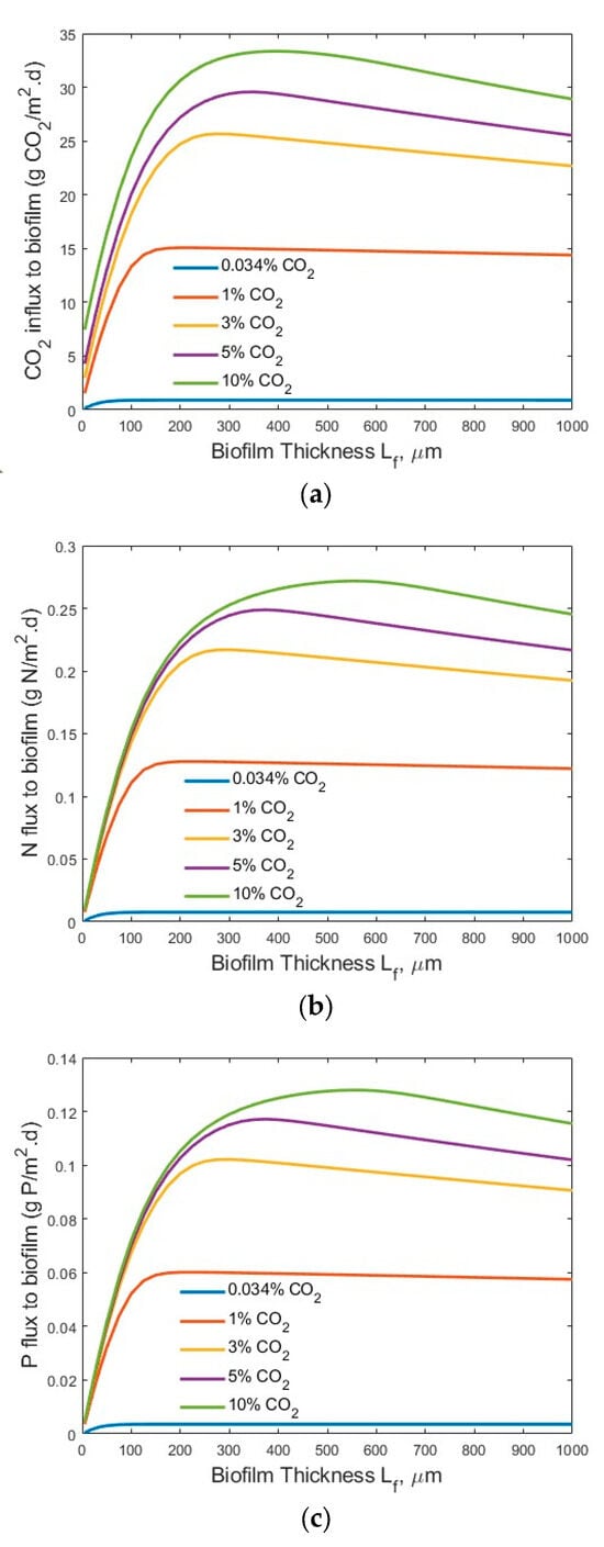 It is interesting to observe that an optimal biofilm thickness existed (Figure 5 and Figure 6) under each set of tested process conditions. The results, shown in Figure 4 and Figure 5, suggest that the concentration of CO2, TN, and TP concentration had a significant impact on the optimal biofilm thickness and the process efficiency (fluxes into the biofilm). The optimal biofilm thickness was found to be approximately 220, 220, 275, 350, and 400 µm for maximum CO2 flux, and approximately 225, 225, 300, 350, and 500 µm for maximum N and P fluxes, under the bulk gas phase CO2 concentrations of 0.034%, 1%, 3%, 5%, and 10%, respectively, and high-strength industrial wastewater conditions. The slight differences of optimal biofilm thicknesses between maximum CO2 flux and maximum TN and TP fluxes are because CO2, TN, and TP are transferred into the defined biofilm zone (or grid cells) for bioreaction in a counter-current diffusion manner. Therefore, CO2 and TN/TP reach maximum flux at different positions in the biofilm (from the membrane–biofilm interface to the biofilm–bulk wastewater stream interface).