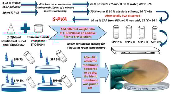 A 3 w/v% solution of PEBAX 1657 was prepared by dissolving it in a 7:3 volume ratio solution of absolute ethanol and water under reflux for 2 h at 80 °C. Similarly, 10 w/v% PVA was prepared by dissolving it in a mixture of water and absolute ethanol (7:3 v/v ratio) under stirring and reflux for 3 h at 90 °C. After the PVA was completely dissolved and the solution cooled, the SSA solution was added. This mixture was then continuously stirred at room temperature for 24 h. Nominal SSA content of the SSA-PVA membrane was 40 wt%. Different amounts of titanium dioxide phosphate (TiO2PO4) (3, 5, and 7 wt%) were subsequently added to a solution of S-PVA and PEBAX 1657 at a blend ratio of 8:2 and stirred for 4 h at room temperature. The resulting solutions were cast onto glass Petri dishes and allowed to dry for 48 h. Figure 1 shows the main steps of the fabrication procedure of membranes.