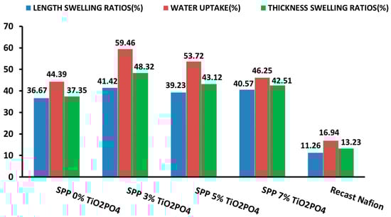 Figure 2 shows the water uptake and swelling ratio of the membranes after soaking in deionized water at room temperature. First, the water uptake increased with increasing TiO2PO4 content, while the swelling ratio in all directions decreased; then, above 3% TiO2PO4, the trends were just reversed. The optimal level of TiO2PO4 is at 3%. The hydrophilicity of TiO2PO4 particles may be responsible for improved water uptake at low nanofiller content. In addition, the presence of TiO2PO4 particles may also increase the porosity of the membranes, which allows water molecules to pass through the membrane more easily, resulting in a higher water transport efficiency and, consequently, an increase in the water uptake of the synthesized membrane [41]. With larger amounts of TiO2PO4, other factors, such as those affecting crystallinity or microporous structure, may prevail and overcompensate the hydrophilic effect, so the combined effect of TiO2PO4 on water uptake and swelling degree may change. Comparing the result with those measured on recast Nafion, it is clearly observed that our blend membranes perform better than recast Nafion in terms of water uptake, while they are inferior in terms of swelling ratio. Unfortunately, the in-plane swelling of our membranes is 3–4 times larger. The in-plane swelling ratio should be kept low to moderate, as in-plane swelling can lead to mechanical damage of the membrane electrode assembly. In contrast, the through-plane swelling is beneficial, helping to establish proper contact between the MEA and the bipolar plates.