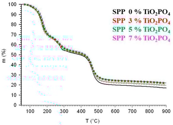 The thermal stability of SPP membranes was evaluated using thermogravimetric analysis, examining samples with different concentrations of TiO2PO4 under argon. Figure 4 shows the TGA results revealing three stages of weight loss. Each membrane first loses weight at around 175 °C, a loss of about 30%, probably due to moisture released from the membrane. After that, the disintegration of oxygen-rich functional groups in the composite membranes causes weight loss between 175 °C and 280 °C. Above 280 °C, further decomposition and structural breakdown of the membranes occur. Both the parent SPP membrane and the membranes loaded with the TiO2PO4 filler decompose according to similar patterns, with minor differences due to the amount of TiO2PO4 used. The presence of nanoparticles has no significant effect on the thermal stability and thermal degradation properties of the blend membranes. Table 2 contains information on the solid residue obtained when membranes were heated to 900 °C.