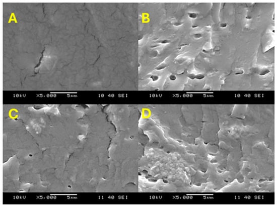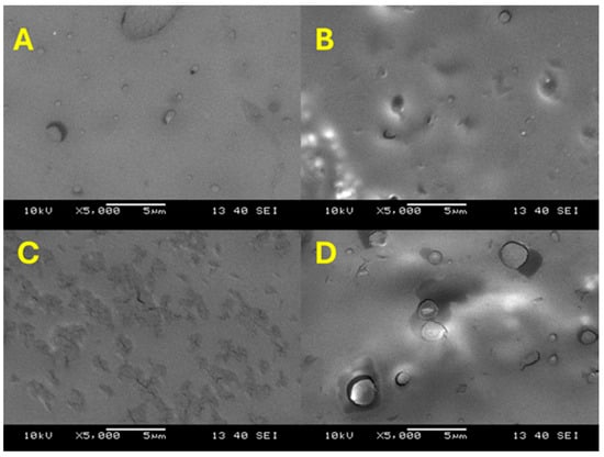 SEM images of the planar surface of SPP blend membranes (A, B, C, and D refer to 0%, 3%, 5%, and 7% TiO2PO4, respectively).