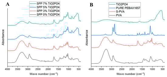 FTIR spectra of (A) SPP blend membranes and (B) the different constituents, such as titanium dioxide phosphate (TiO2PO4), PVA, and S-PVA, as well as the pure PEBAX 1657.