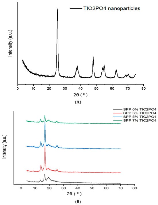 (A) X-ray diffraction for TiO2PO4 nanoparticles; (B) X-ray diffraction for SPP blend membranes.