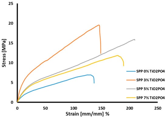 The mechanical strength of membranes is a crucial characteristic. It has been shown that the addition of small amounts of fillers to hybrid membranes can be an effective way to improve the mechanical properties of polymers [33]. Tensile tests were performed to evaluate the effect of TiO2PO4 nanofiller on the mechanical properties of SPP membranes. The results obtained on SPP membranes are shown in Figure 9. The results indicate that the parent blend membrane showed the lowest performance, with a maximum tensile strength of 5.8 MPa. The presence of TiO2PO4 nanofiller at concentrations of 5% and 7% led to an increase in membrane robustness, with a strength of 15.2 and 12.3 MPa and significant elongation at break. An even more pronounced improvement was achieved at 3% TiO2PO4 content, which led to an increased elongation at break and a tensile stress of 19.5 MPa. It is assumed that the uniform, fine distribution of TiO2PO4 nanoparticles is responsible for the better mechanical properties. This phenomenon is due to the fact that nanoparticles promote the distribution of energy in the material [42,45]. In addition, hydrogen bonds between the organic components and TiO2PO4 facilitate the dissipation of mechanical stresses. The composite membrane containing 3% TiO2PO4 may be a promising for PEMFC applications.