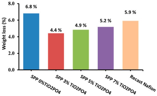 Fenton’s reagent test, a common method for assessing chemical stability, is employed to determine the resilience of proton exchange membranes (PEMs) against radical species (OH· and OOH·) generated at the cathode in a PEM fuel cell. Figure 10 shows the percentage of mass loss of the produced membranes after exposure to Fenton’s reagent test. The membranes were immersed in the reagent for 24 h at 80 °C [38]. In the presence of the filler, the rate of weight loss decreased. This may be because TiO2PO4 has antioxidant or free radical-scavenging properties and can thereby reduce the effects of hydroxyl radicals [42,43]. This behavior can reduce the oxidative damage of the polymer matrix. In addition, hydrogen bonds and electrostatic interactions between TiO2PO4 and the hydroxyl groups of S-PVA and PEBAX 1657 promote the interfacial adhesion process, which also acts as a barrier against the oxidative behavior of Fenton’s reagent. The results shown in Figure 10 clearly proved that the chemical stability of the synthesized membranes was better than that of recast Nafion. The chemical stability of the synthesized membranes with 3% TiO2PO4 filler content was superior to that of other blended membranes. Therefore, we expect the synthesized SSP with 3% TiO2PO4 filler to perform well in the fuel cell.